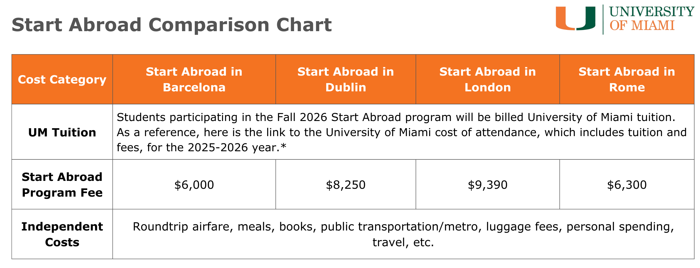 *Click here to see cost of attendance for the 2025-2026 year. Deadlines and fees may be subject to change For UM employees: Start Abroad is eligible for the tuition remission benefit.